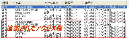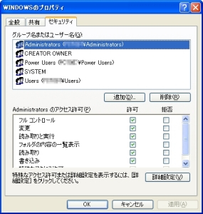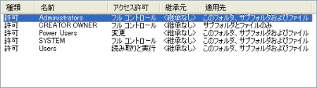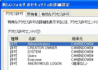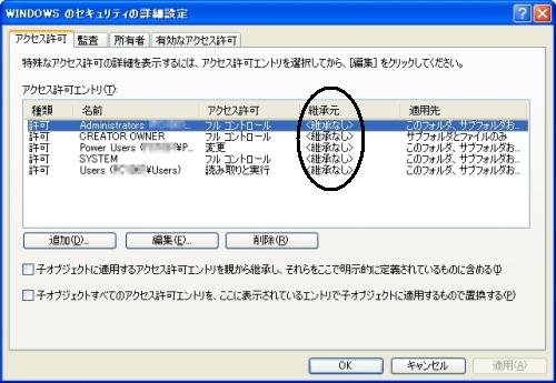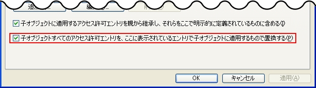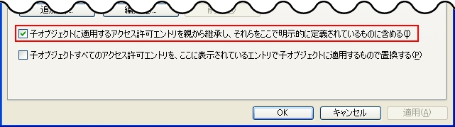 親のアクセス権を受け継ぐ =『子オブジェクトに適用するアクセス許可エントリを親から継承し、それらをここで明示的に定義されているのもに含める』 にチェックを入れる