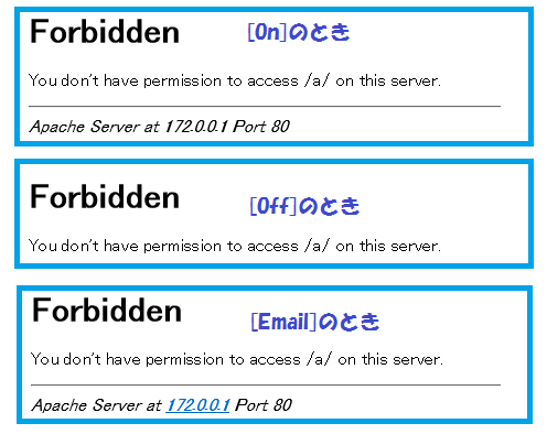 # vi httpd.conf -- httpレスポンスのサーバー情報を最小限にする -- サーバー上で 「wget -S http://localhost」実行時の「Server」の情報で確認可能 ServerTokens prod -- エラー時の情報ページの内容を制限…参考 -- ServerTokensで制限した範囲の内容が表示されます。 ServerSignature Off -- エラーページに表示されるメールアドレス。 ServerAdmin root@localhost -- 上書設定用のファイル名を指定する。(AllowOverride で許可されている場合のみ) AccessFileName .htaccess -- server-statusで、より詳細が表示可能になる -- ※<Location /server-status>セクションが有効の場合 ExtendedStatus Off
