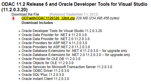 今回の環境はOracle11g(クライアント)なので、それに合わせたもの(ODTwithODAC1120320_32bit.zip)をダウンロードします。