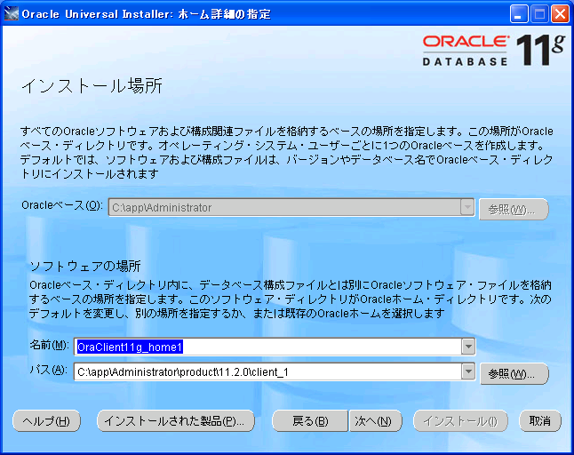 →画像拡大 クライアントを選択 | →画像拡大 [名前]に、既にインストール済のOraHomeを選択しなおす |