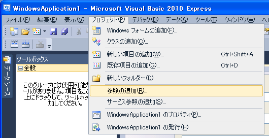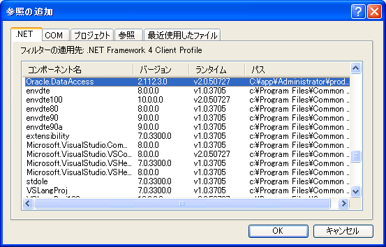 その後、[プロジェクト] → [参照の追加] から「Oracle.DataAccess」を選択し、OKをクリックする。