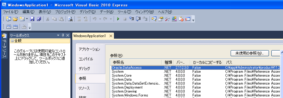 念のため、プロジェクトプロパティ内の[参照]タブ内に「Oracle.DataAccess」が存在するかを確認する