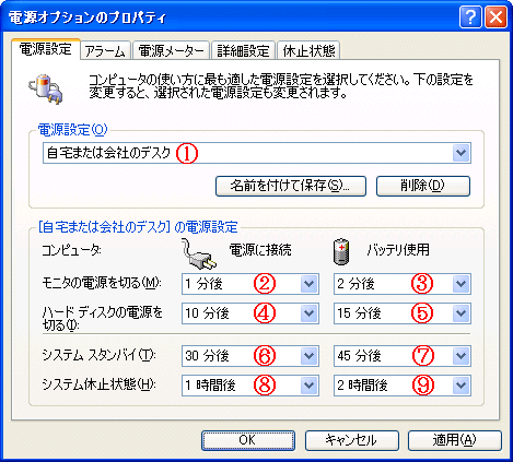 | 8 | システム休止状態 (AC) | 60 分後 |
