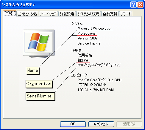 | Organization | 登録されている組織 | 画像3 | systeminfoの登録されている組織: |