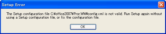 | The Setup configuration file "xmlファイル" is not valid. Run Setup again without using aSetup configuration file, or fix the configuration file. |