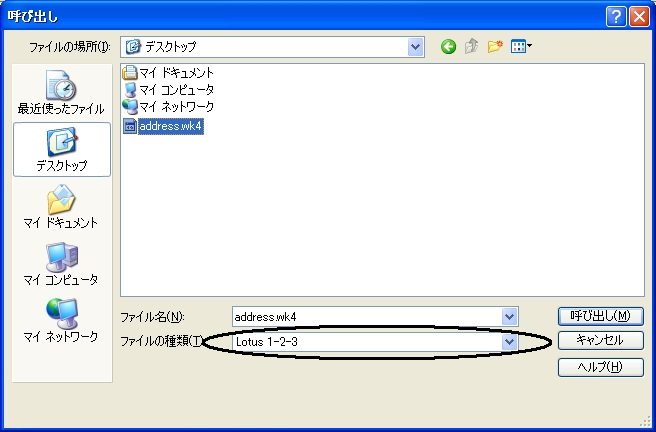 - ファイルの種類を【Lotus 1-2-3】を選択し、wk4ファイルを指定する:画像