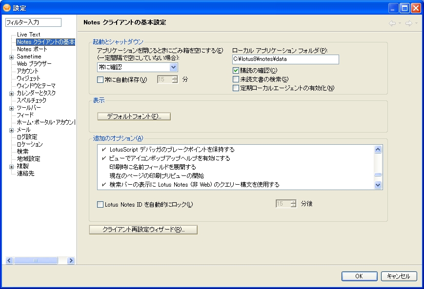 | Directory | 変更すると、NewDirectoryがNotes.iniに書き込まれる。 ノーツを終了すると、この値がDirectoryへ適用され、NewDirectoryが消える | ローカル アプリケーション フォルダ | 画像 |