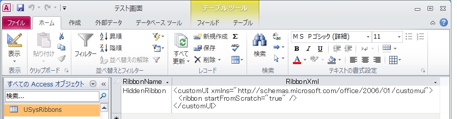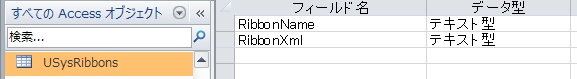 テーブル【USysRibbons】を新規作成し、フィールド名[RibbonName][RibbonXml]を追加する。
