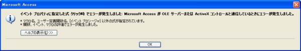 イベントプロパティに指定した式 クリック時 でエラーが発生しました:Microsoft Office AccessがOLEサーバーまたはActiveXコントロールと通信指定いるときにエラーが発生しました。